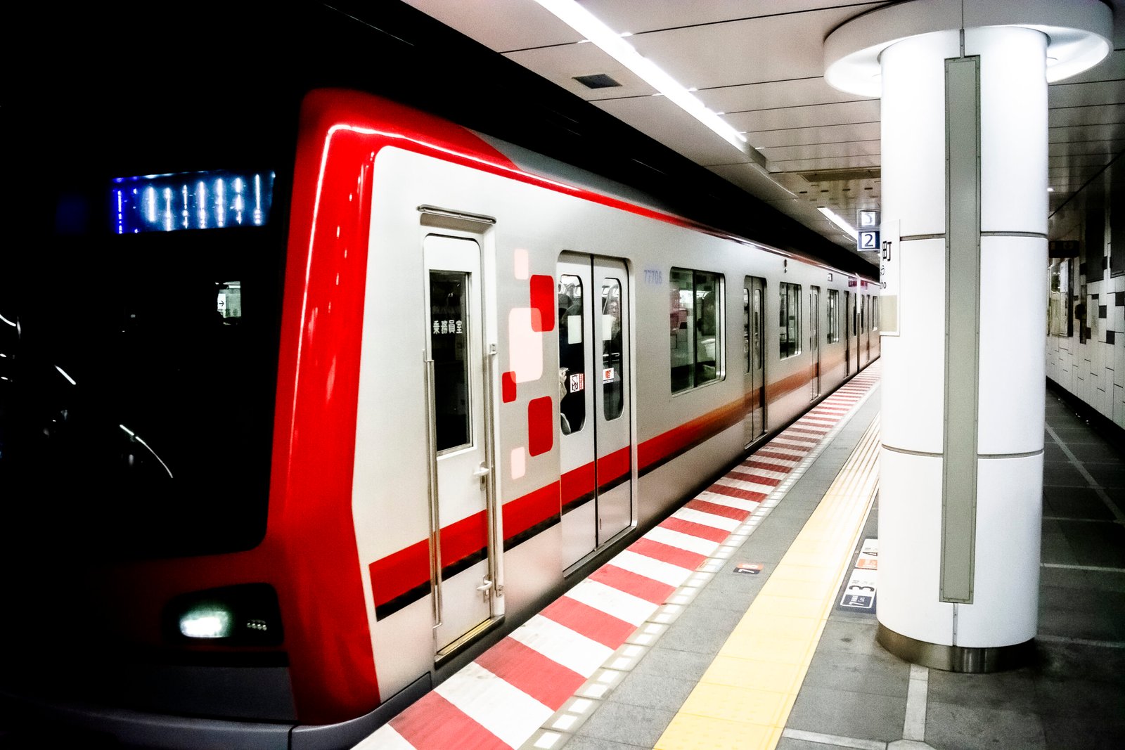 Man in Japan Sub Jungle captures a moment of quiet tension within a modern Japanese subway station. A red-and-white train rests along the platform, its sharp geometric lines contrasted by glowing columns, tiled walls, and the rhythmic markings of the station floor. Reflections in the windows hint at human presence—subtle, fleeting—set against the clean precision of the underground environment. The image balances motion and stillness, order and anonymity, transforming everyday transit into an atmospheric urban landscape.